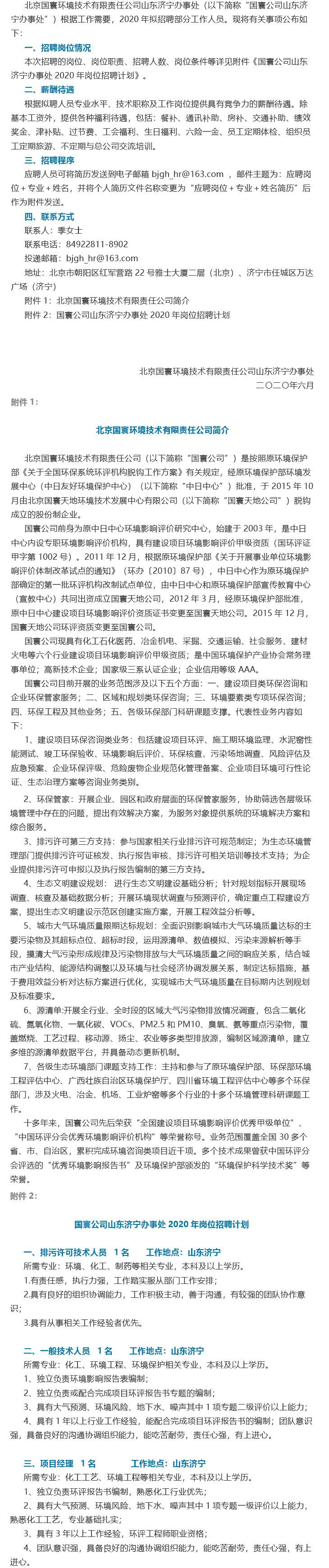 北京國寰環境技術有限責任公司山東濟寧辦事處招聘啟事