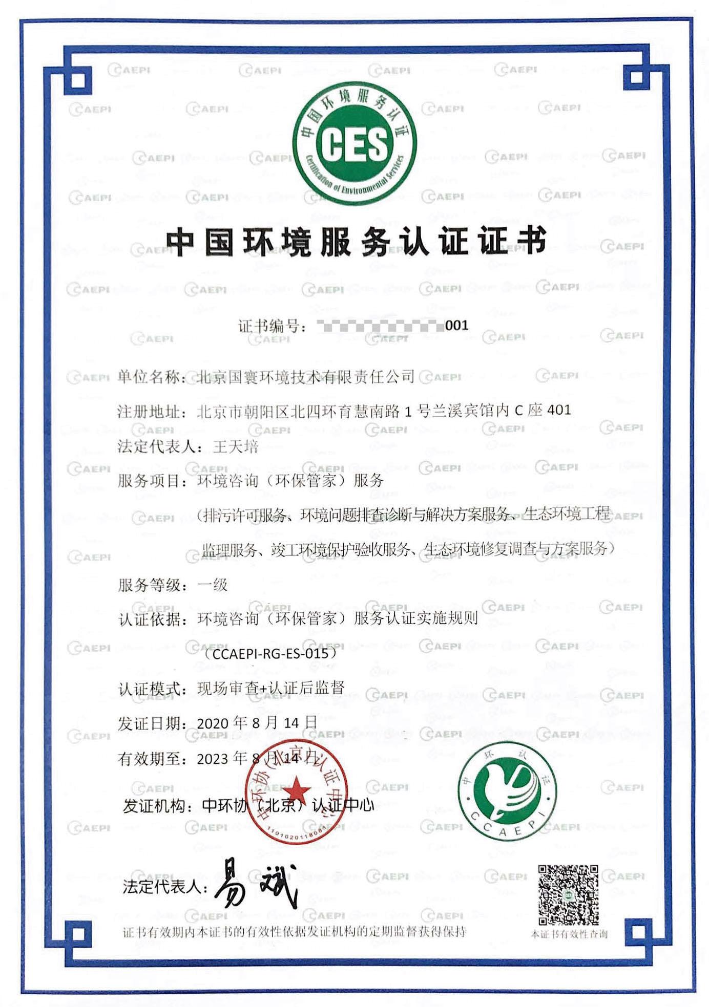 國寰公司順利通過認證,成為國內首家環境咨詢(環保管家)服務一級機構