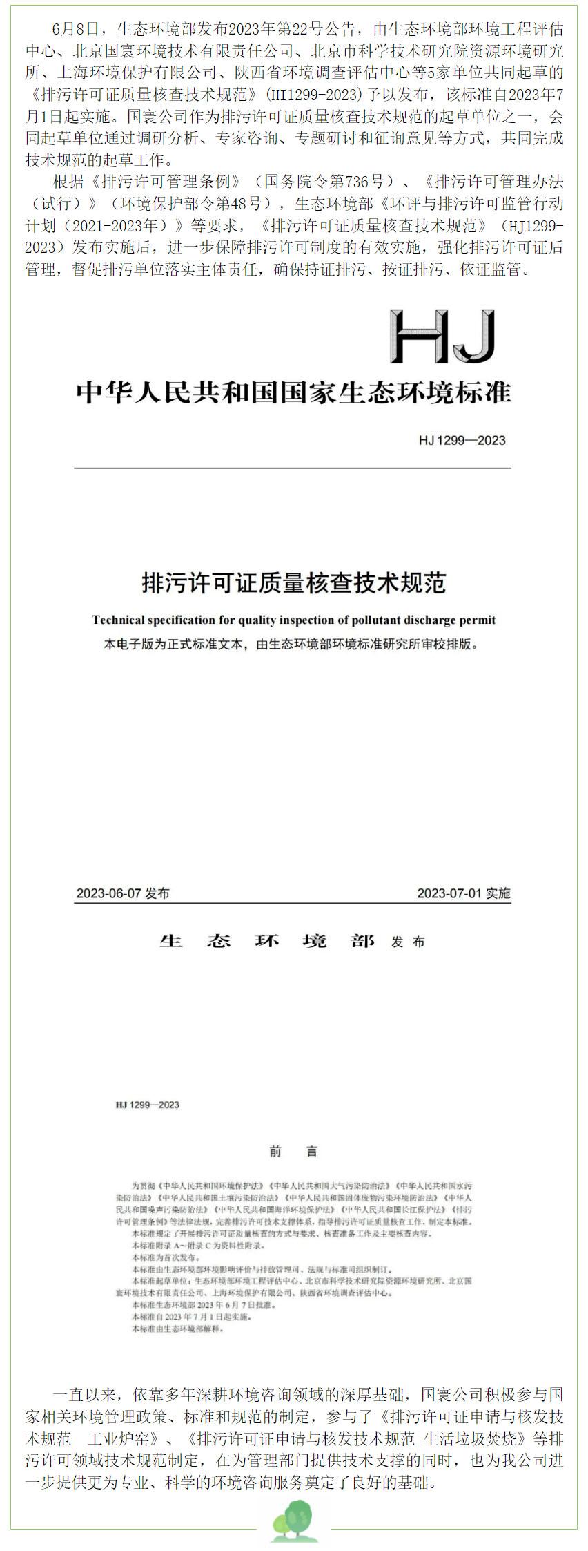 國寰公司參與起草的《排污許可證質量核查技術規范》(HJ1299-2023)正式發布